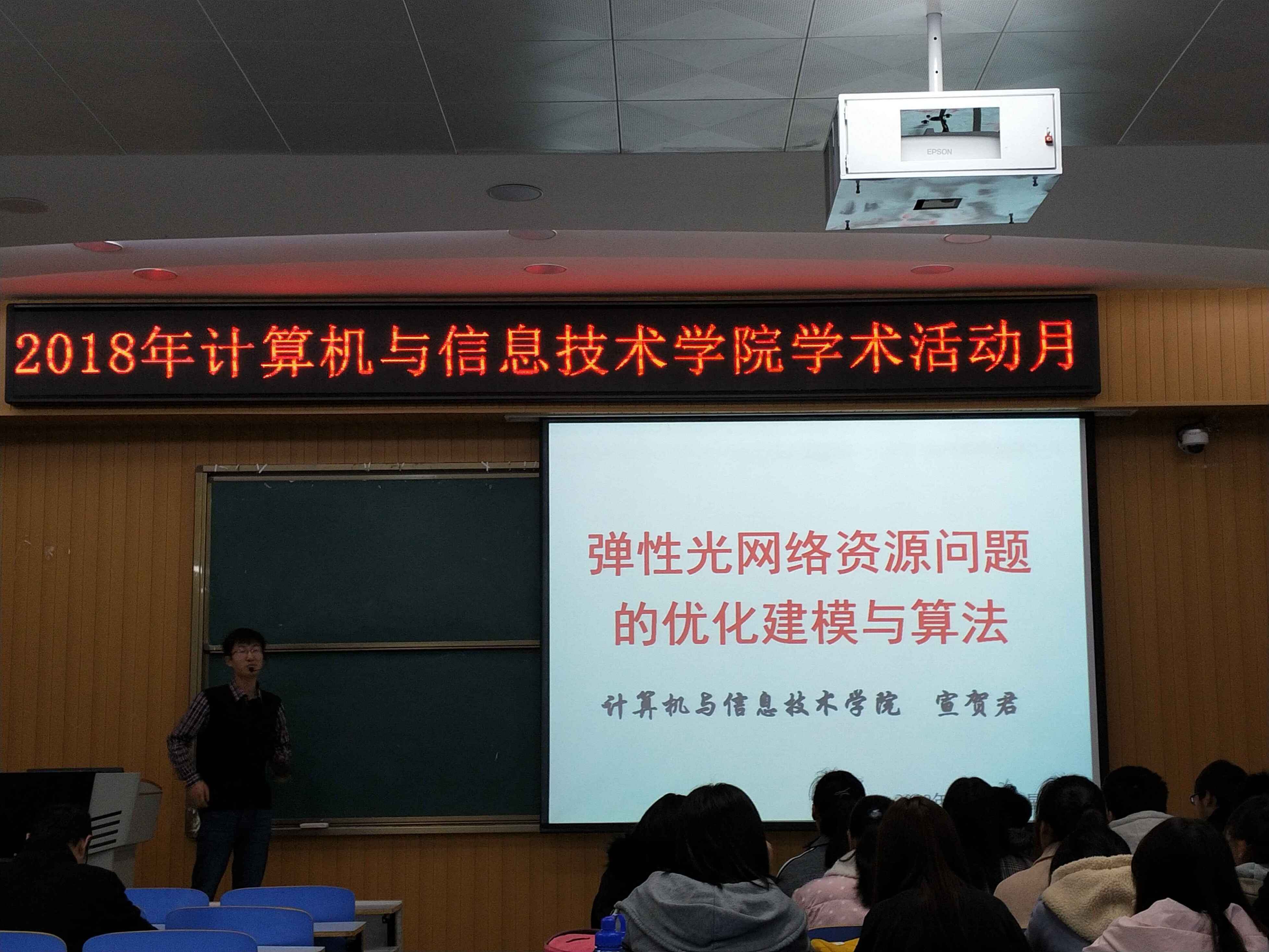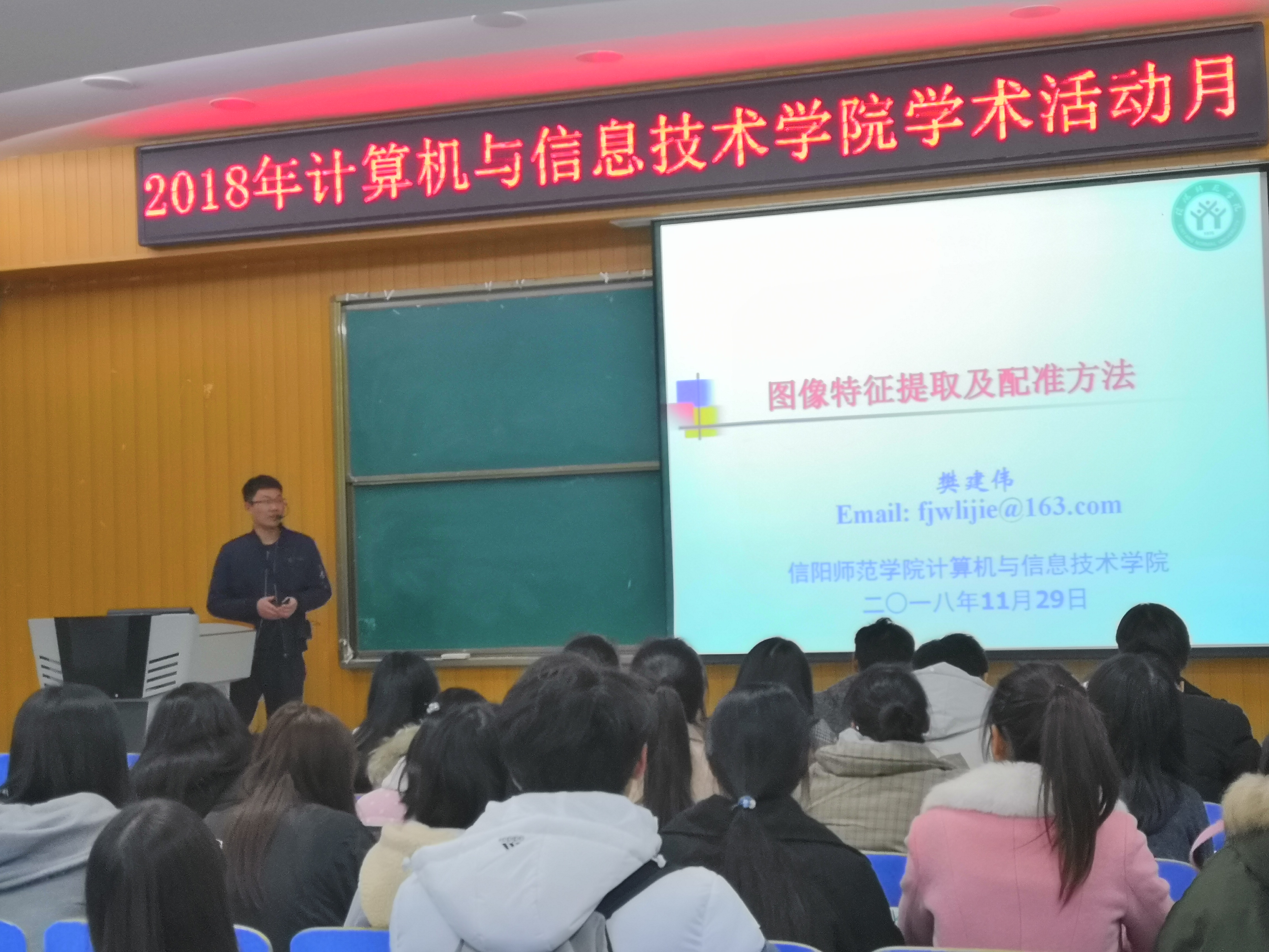 11月29日下午,信阳师范学院ok138cn太阳集团古天乐樊建伟、宣贺军博士在计算机楼107教室分别作了题为“图像特征提取及配准方法”和“弹性光网络中资源分配问题的优化建模与算法研究”的学术报告。计算机学院副院长黄俊、冯岩和李国梁等学院领导、学院部分教师、全体研究生以及部分本科生参加了报告会。报告会由ok138cn太阳集团古天乐副院长冯岩主持。
