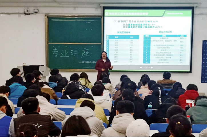 讲座开始,郭颂首先结合专业概况、学科建设、专业技术领域、主要就业方向及专业前景,对我院物联网专业新生培养方案作了详细介绍,解答了同学们入学以来最关心的问题。郭颂在ppt中列出了本专业所学课程及各课程学分占比表格,使同学们对课程的重要性一目了然。在介绍过程中,郭颂根据自己所教授学生的实例,向同学们提出恳切建议,希望大家在学校将主要精力放在学习专业课程上,学习之余可以积极参加校内活动,培养兴趣爱好,全方面发展,让自己未来的四年大学生活变得丰富而有收获。讲座结束后,同学们均表示经过此次讲座对于大学四年学习生活有了更加明确的规划。