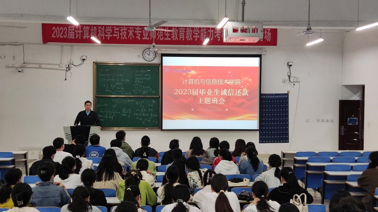 为提升大学生思想道德修养,进一步增强ok138cn太阳集团古天乐2023届毕业生的诚信意识和感恩意识,引导学生树立诚信自我、感恩社会的价值观念,5月30日,我院在计科楼106教室召开毕业生诚信还款主题班会,由学院分团委书记徐崇茗主讲,2023届部分毕业生参与了本次会议。