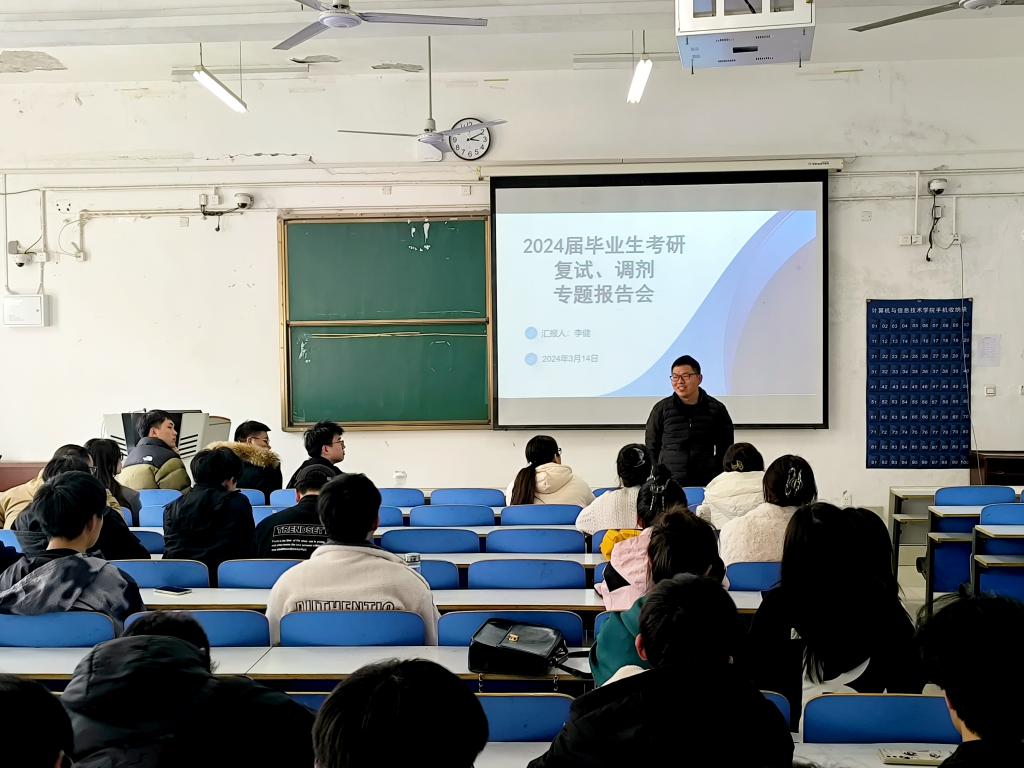 为持续推进对毕业生的服务指导和关心关怀工作,进一步提升考研复试通过率,3月14日,我院于计科楼103教室召开2024届应届毕业生考研复试、调剂指导会,李健博士做指导报告,会议由毕业班辅导员王丝雨主持。