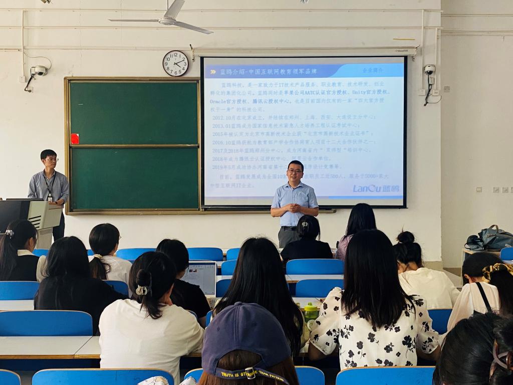 蓝鸥科技有限公司院校合作经理袁永成简要介绍了公司发展历程,详细阐释了公司主营方向、就业保障、招聘计划等重点事项,并结合岗位需求向毕业生进行了招聘宣讲。