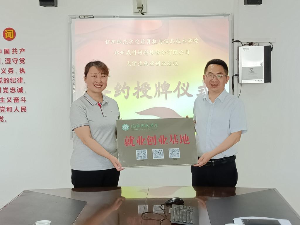 在郑州威科姆科技股份有限公司洽谈会上,公司负责人向熊炎一行实地访企拓岗和创建就业创业基地表示欢迎,对学校和计算机等专业的高质量人才输送表示感谢,并介绍了威科姆科技和威科姆教育的发展历程、行业特色、人才需求和校企深化合作等情况。熊炎介绍了学院的专业设置、学科建设、师资队伍和人才培养等情况,并着重提出了大学生实习实训、人才培养和就业推荐等方面的合作举措。在沟通交流中,校企双方达成了一致意见,签订了合作协议书,并举行了就业创业基地授牌仪式。