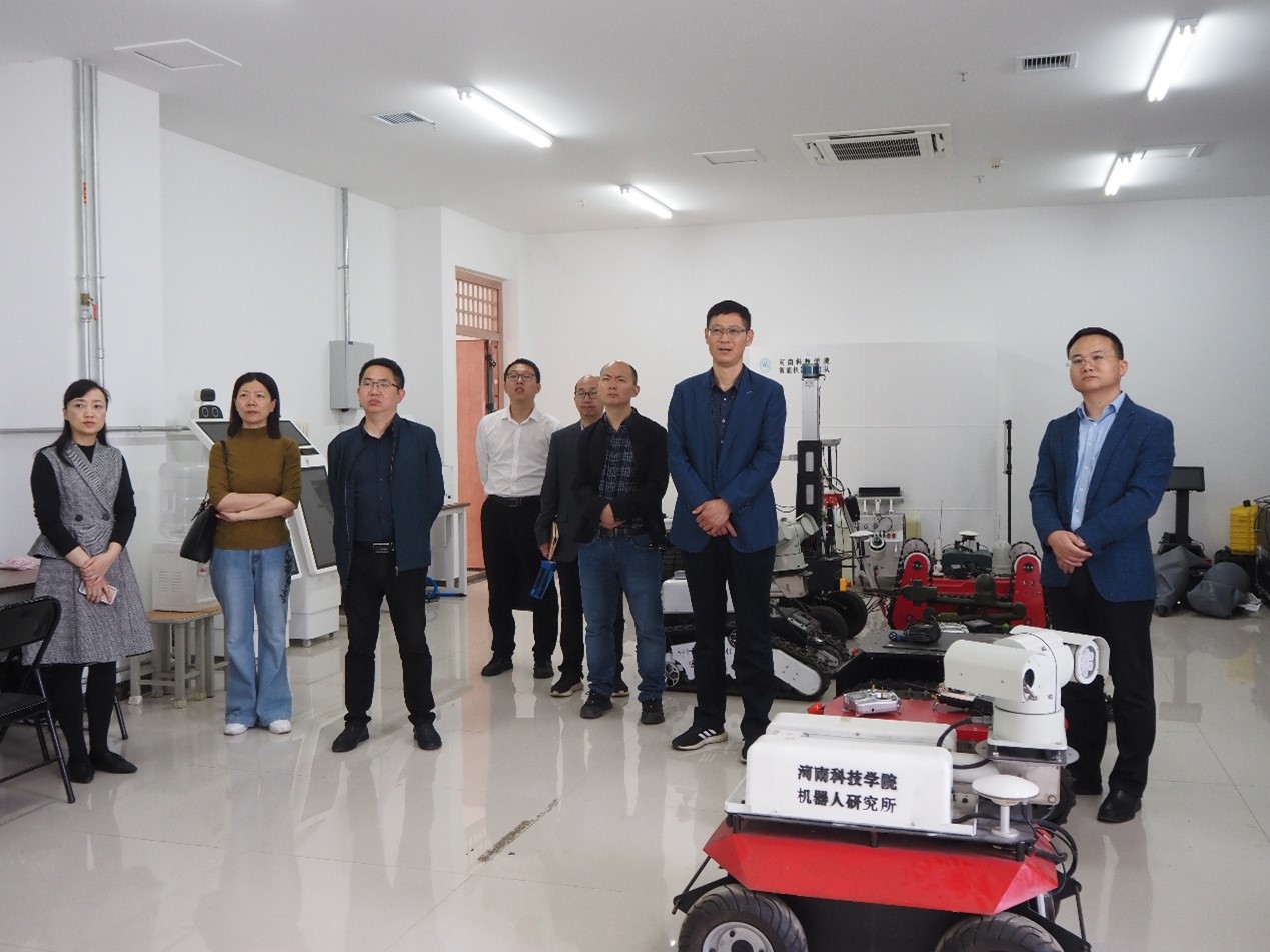 考察团队实地参观了河南科技学院人工智能学院的原创性智能机器人研发平台,该研发平台以机器人产品中试生产线为流程,针对数字仿真、技术攻关、硬件控制、感知与决策、系统集成、系统测试、性能优化、设备检验等关键生产阶段成立研发团队,开展面向实际需求的机器人产品研发。依托该研发平台,人工智能学院取得了众多的国家级、省级重点研发项目,所开发多项产品也投入实际应用,取得了显著的经济效益。在座谈会上,人工智能学院党委书记叶晖对熊炎、冯岩一行来院考察交流表示热烈欢迎,并介绍了学院发展历程和人才培养情况,院长蔡磊详细介绍了人工智能学院近年来围绕国家重大需求,开展有组织科研攻关与产品研发的工作体会。与会人员围绕学科专业建设、高层次人才引进、工科类学院发展面临的新问题与新情况进行了深入探讨,双方希望以此次考察交流为契机,增进相互了解,拓展合作领域。