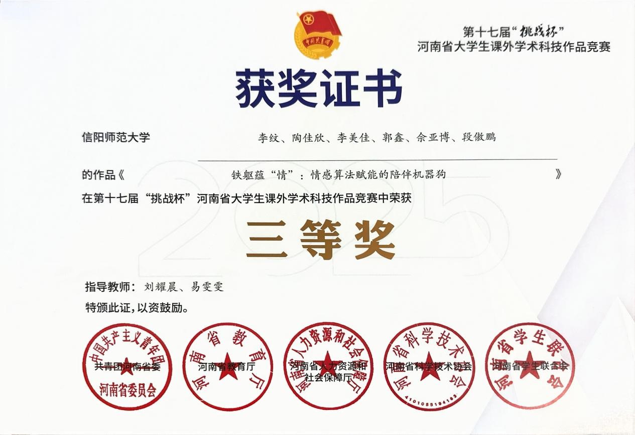 近日,由共青团河南省委、河南省教育厅等单位联合主办的第十七届“挑战杯”河南省大学生课外学术科技作品竞赛中,我院参赛团队凭借扎实的技术创新与实践应用能力,在全省千余项作品中脱颖而出,荣获省级一等奖1项、三等奖2项,以优异成绩充分彰显学院学科建设与人才培养的显著成效。