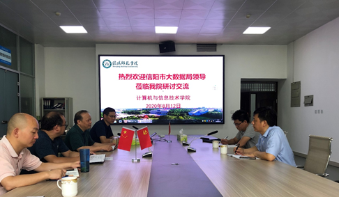2020年8月12日上午,信阳市大数据局副局长刘道杰、人事科长杨阳一行来我院座谈交流。我院院长祁传达、副院长冯岩及部分青年学术骨干参与了交流。